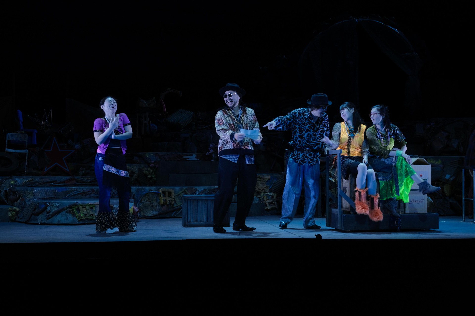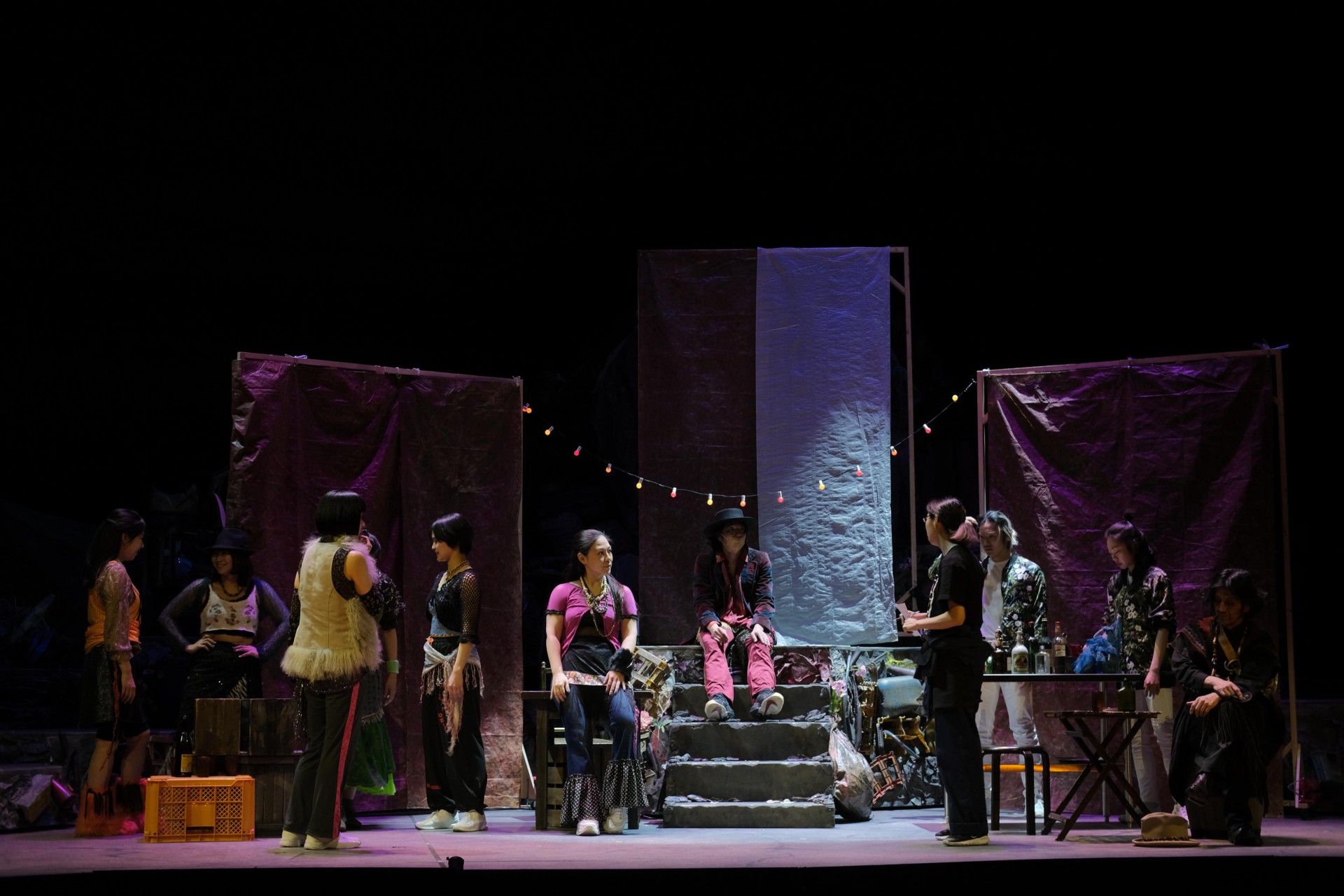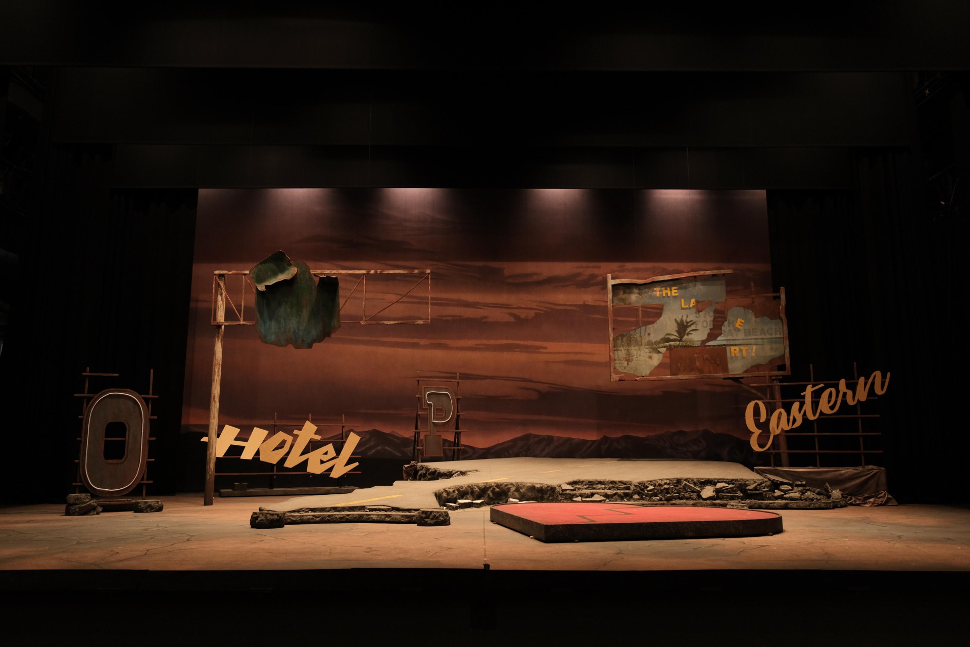 I set the production 20-30 years in the future, in a kind of “no man’s land” where people travel and live freely, without control. Think of the desert landscapes in Mad Max. The Act 1 design is inspired by what I call “beautiful rubble.” I originally wanted a large highway running over it, but for practical reasons, the highway didn’t make it!