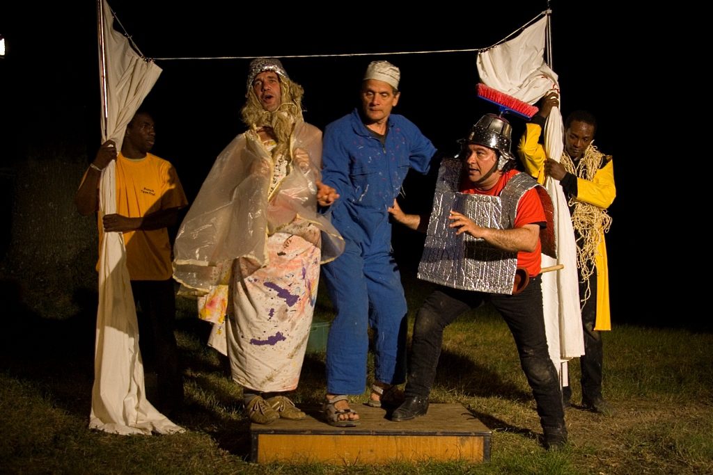 CONCEPT: The fictional “Compagnie Internationale d’Athènes” (CIA) was scheduled to present A Midsummer Night’s Dream, but when the actors, sets, and costumes failed to arrive, six technicians performed the play with whatever materials they could find. Created as a stripped-down, highly mobile production designed to be performed in non-traditional spaces—fields, village squares, community halls—bringing theatre to audiences far removed from cultural offerings.